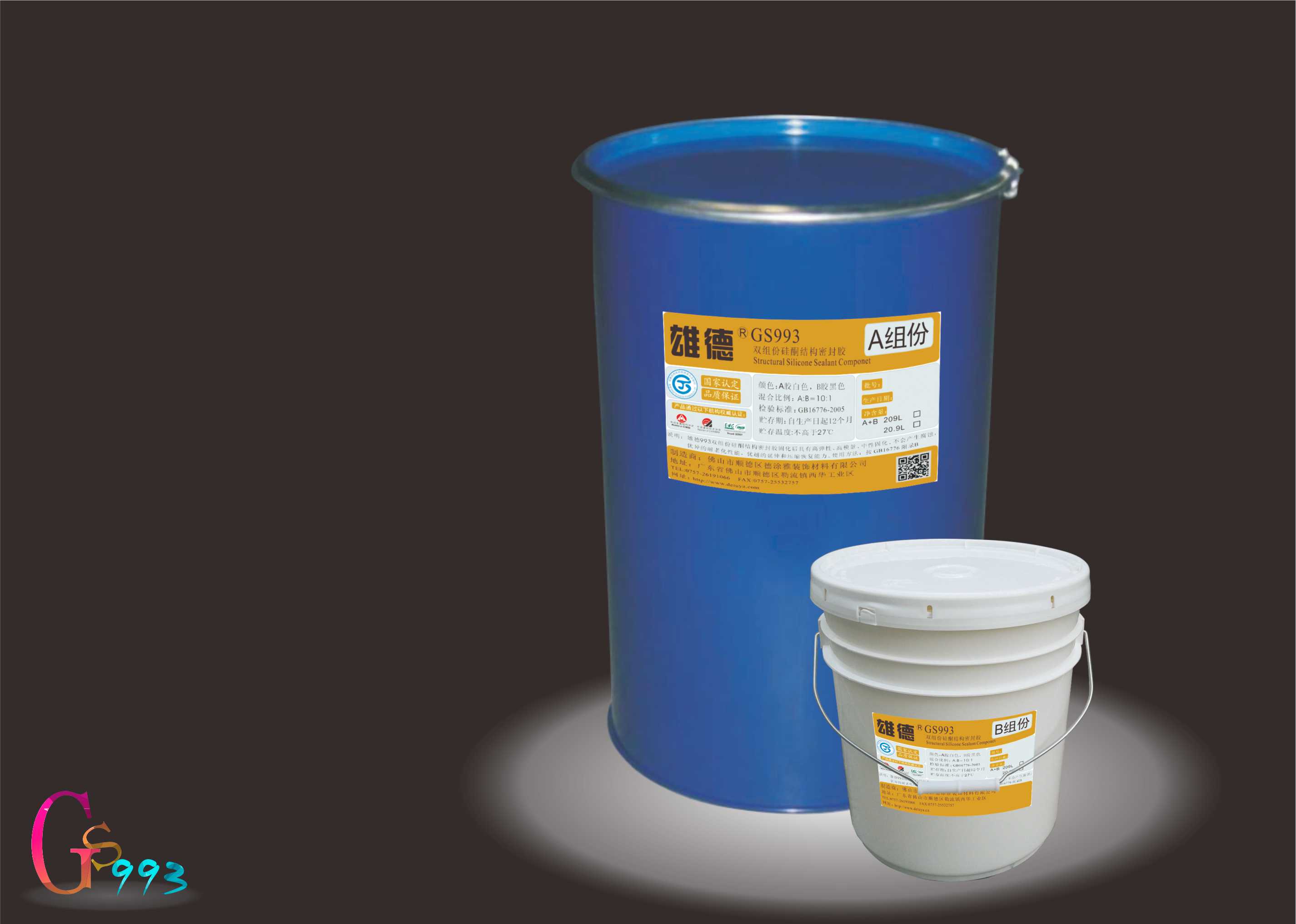 GS993 双组分硅酮结构密封胶是一款分为A组分和B组分的硅酮密封胶,多用于大型工程和用量较大的结构装配项目,该密封胶配合双组分打胶机使用效果更佳。